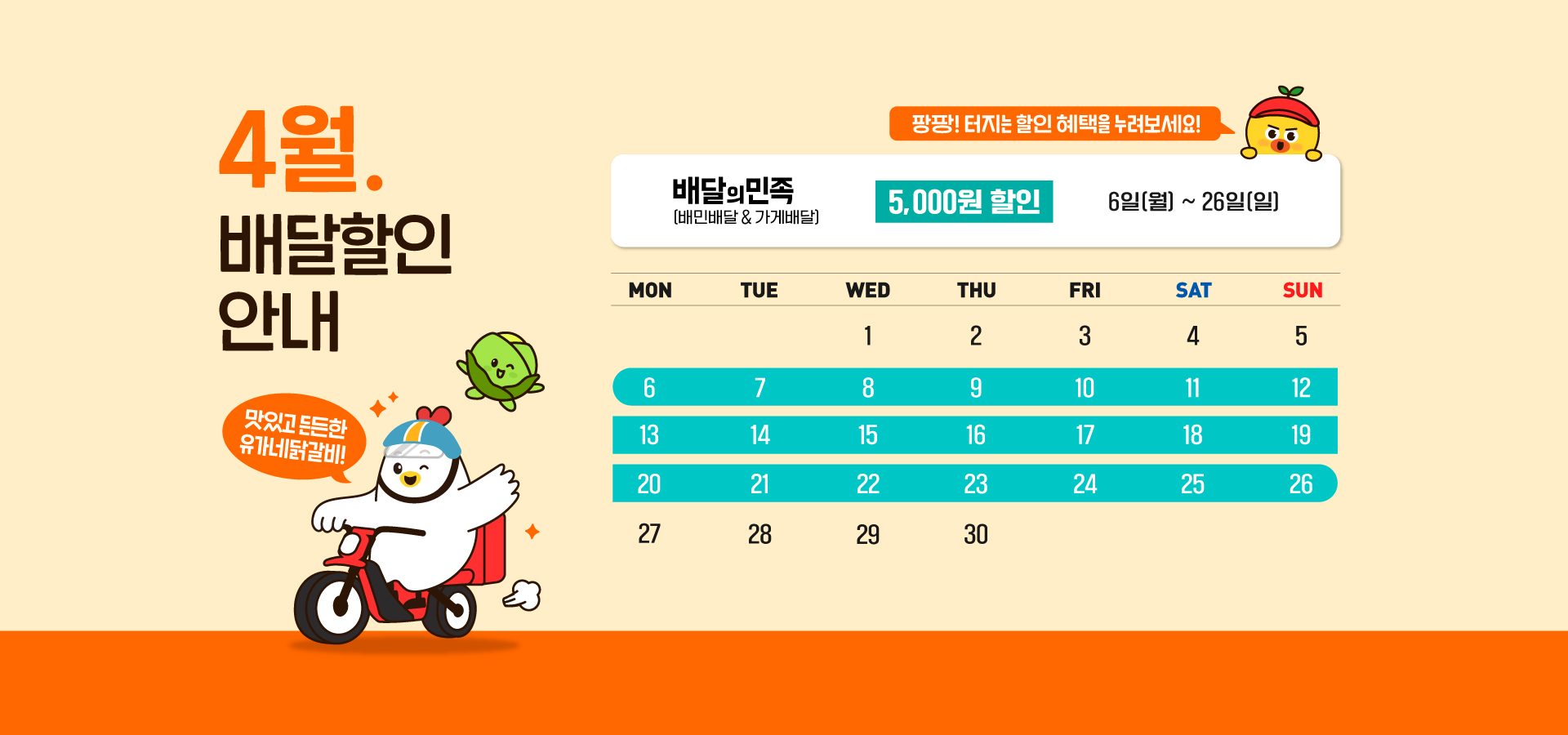 [유가네닭갈비 4월 배달 할인 프로모션 안내] 1. 배달의 민족 - 할인 내용 : 5,000원 할인 - 일정 : 4/6(월)~4/26(일) - 참여 방법 ① '배달의민족' 앱 내 브랜드관을 통해서 최대 5,000원 할인 쿠폰 다운로드 ② 가게배달 : 25,000원 이상 주문 시 배민배달 : 25,000원 이상 주문 시 ③ 결제 시, 다운로드한 쿠폰 적용