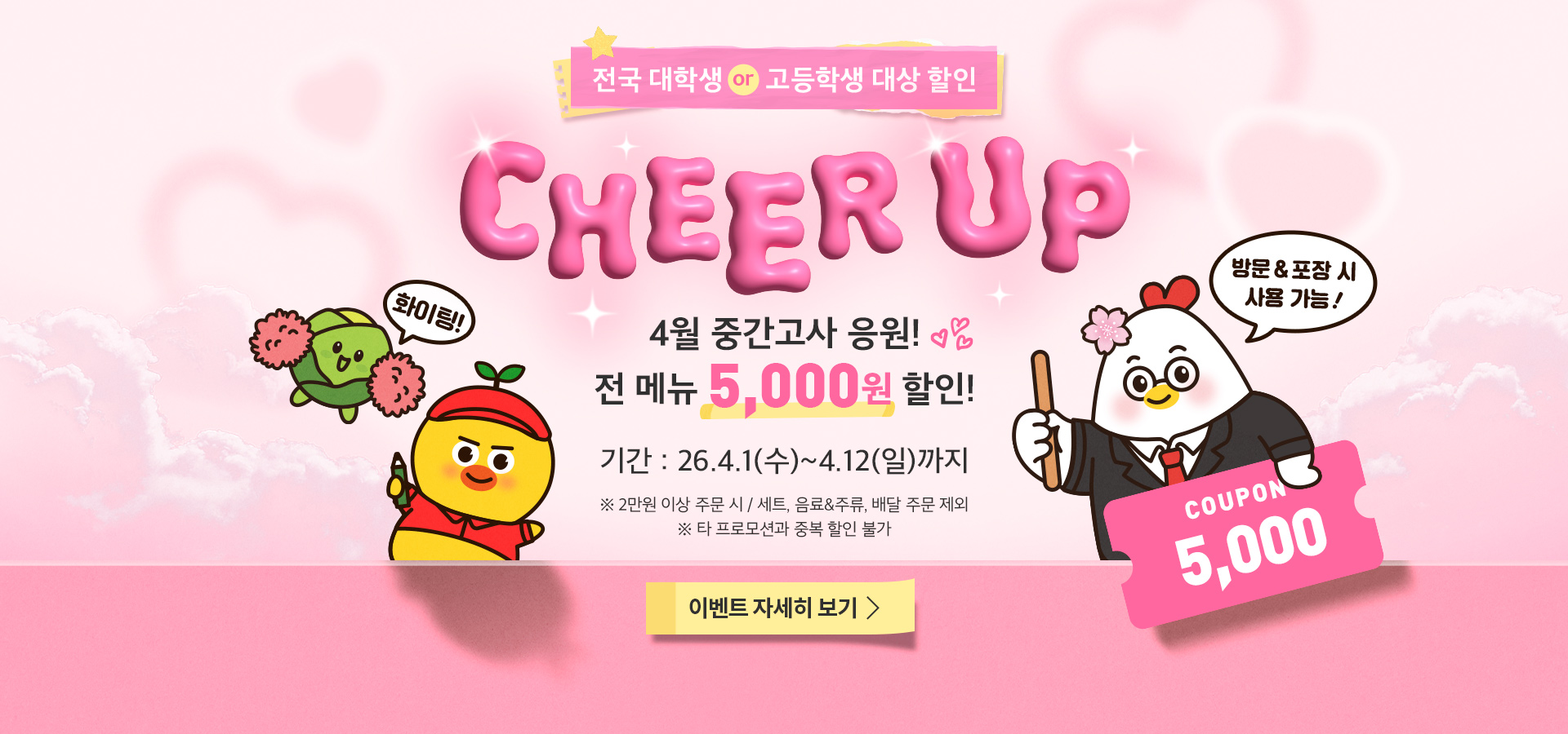 1. 기간 : 2026.04.01(수) ~ 04.12(일) *쿠폰 사용 기한 ~04.12(일) 2. 내용 : 시험준비에 한창인, 지친 여러분을 위해 유가네가 특별히 준비한 '치얼업 프로모션' 이번 중간고사엔 유가네 먹고 100점 맞아보자구요~ 화이팅! 3. 참여 방법 - 유가네 공식 카카오톡 채널 추가하기 - 유가네 5,000원 쿠폰 다운로드 받기 - 우리집 근처 유가네닭갈비에 방문해 유가네 든든하게 즐기기! *고등학생&대학생을 인증할 수 있는 학생증, 교복 등 제시 필수 *하단부 사용 불가 매장을 꼭! 확인하고 방문해 주세요 ...