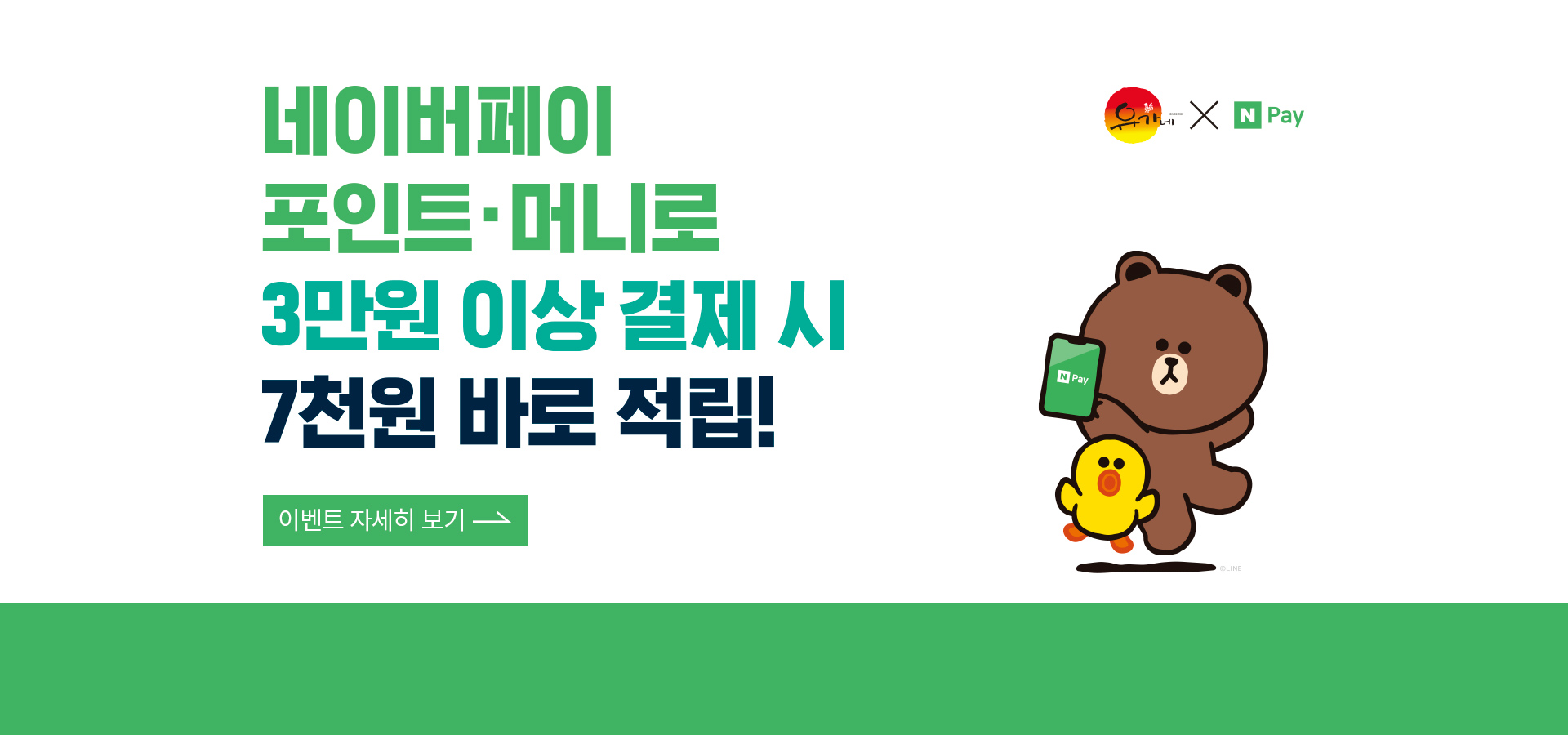[이벤트 내용] 1. 기간 : 2023년 3월 1일 ~ 2023년 4월 31일 ※주 1회 참여 가능(4/3~9, 4/10~16, 4/17~23, 4/24~30) 2. 내용 : 매장에서 3만 원 이상 네이버페이 결제 시 7천 원 바로 적립(네이버포인트) 3. 참여방법 1) 매장에서 3만 원 이상 결제를 네이버페이 현장결제 QR코드로 전액 결제 2) 결제 후 바로 7천 원 네이버포인트 적립받기! [유의사항] - 본 이벤트는 매장에서 네이버페이 현장결제로 3만원 이상 전액 결제 시, 포인트 7천원이 즉시 적립됩니다. (카드결제, 제로페이, 라인페이 제외) - 이벤트 기간 내 매주 1인 1회 참여 가능합니다. - 방문 시, 테이블 당 1회 사용 가능합니다. - 다른 이벤트 혜택과 중복 적용이 불가합니다. - 배달메뉴 및 세트메뉴와 중복 적용이 불가능합니다....