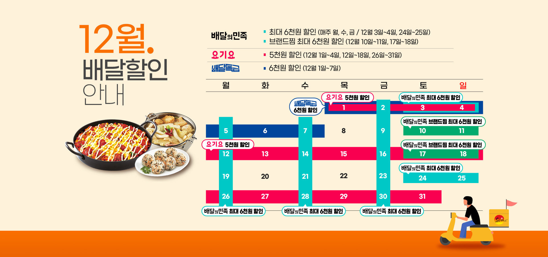 [유가네닭갈비 12월 배달 할인 프로모션 안내] 1. 요기요 - 할인 내용 : 1, 3, 5주차 5,000원 할인 - 일정 : 12/1~4일(목~일), 12/12~18일(월~일), 12/26~31(월~토) ① '요기요' 앱을 통해 주문 시, 자동 할인 혜택 적용 ② '요기서 1초 결제' 또는 '요기서 결제' 이용 시에만 할인 적용 가능 2-1. 배달의 민족 - 할인 내용 : 매주 월, 수, 금 / 1, 4주차 주말 최대 6,000원 할인 - 일정 : 매주 월, 수, 금 / 주말(12/3~4일(토~일), 12/24~25일(토~일)) - 참여 방법 ① '배달의민족' 앱 내 브랜드관을 통해서 최대 6,000원 할인 쿠폰 다운로드 ...