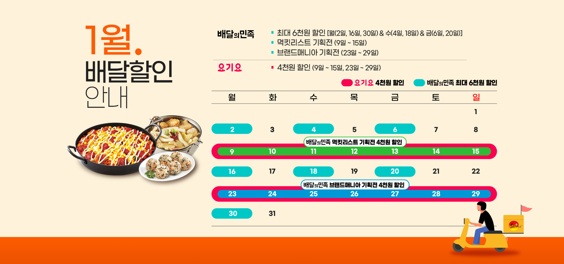[유가네닭갈비 1월 배달 할인 프로모션 안내] 1. 요기요 - 할인 내용 : 2, 4주차 4,000원 할인 - 일정 : 1/9~15일(월~일), 1/23~29일(월~일) ① '요기요' 앱을 통해 주문 시, 자동 할인 혜택 적용 ② '요기서 1초 결제' 또는 '요기서 결제' 이용 시에만 할인 적용 가능 2-1. 배달의 민족 - 할인 내용 : 매주 월, 수, 금 최대 6,000원 할인 - 일정 : 매주 월, 수, 금 - 참여 방법 ① '배달의민족' 앱 내 브랜드관을 통해서 최대 6,000원 할인 쿠폰 다운로드 ② 결제 시, 다운로드한 쿠폰 적용 2-2. 배달의 민족(먹킷리스트 기획전) ...