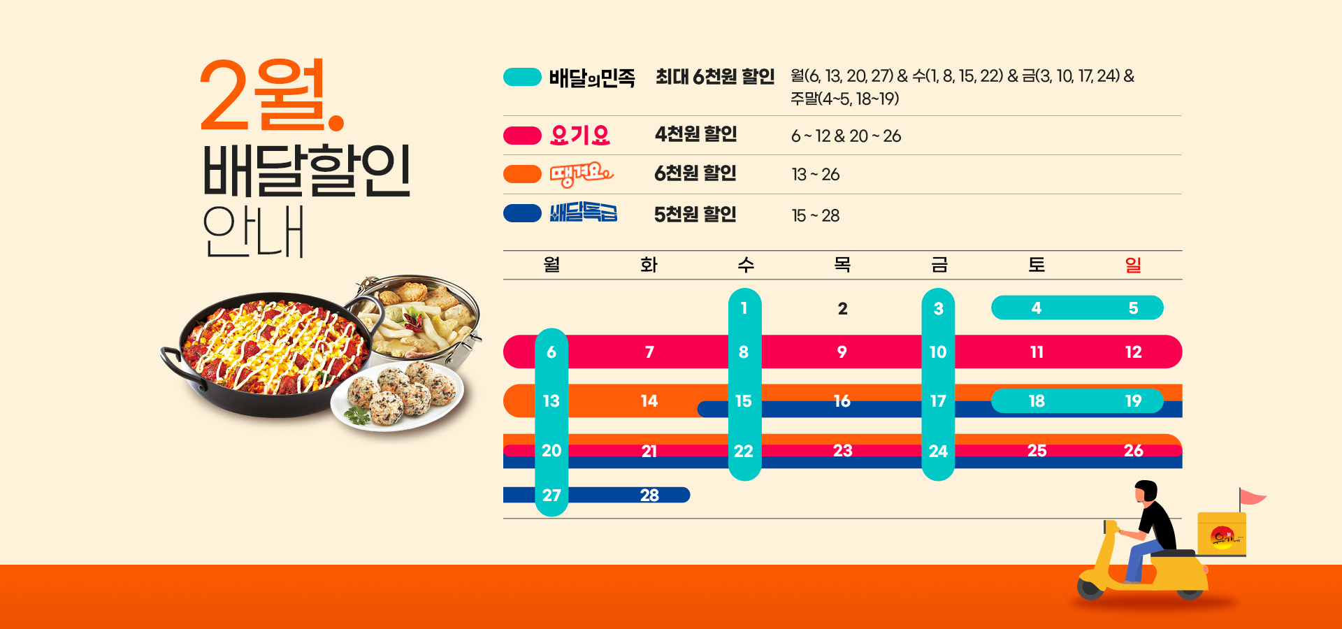 [유가네닭갈비 2월 배달 할인 프로모션 안내] 1. 요기요 - 할인 내용 : 2, 4주차 4,000원 할인 - 일정 : 2/6~12일(월~일), 2/20~26일(월~일) ① '요기요' 앱을 통해 주문 시, 자동 할인 혜택 적용 ② '요기서 1초 결제' 또는 '요기서 결제' 이용 시에만 할인 적용 가능 2. 배달의 민족 - 할인 내용 : 매주 월, 수, 금 / 1, 3주 주말 / 최대 6,000원 할인 - 일정 : 매주 월, 수, 금 / 주말(2/4~2/5, 2/18~2/19) - 참여 방법 ① '배달의민족' 앱 내 브랜드관...