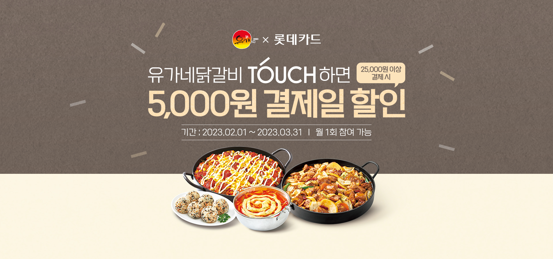 **클릭 시, 롯데카드 모바일앱으로 연결됩니다. 1. 기간 : 2023년 2월 1일 ~ 2023년 3월 31일 ※월 1회 참여 가능 2. 내용 : 롯데카드앱에서 '유가네닭갈비' 혜택 TOUCH 하면 롯데카드로 2만5천원 이상 결제 시, 5천원 청구할인 3. 참여 방법 1) 롯데카드앱 > TOUCH 혜택 > '유가네닭갈비' 혜택 TOUCH 2) 행사 기간 내 유가네닭갈비 매장에서 롯데카드로 2만 5천원 이상 결제 3) 혜택이 적용되면 알림 메시지 발송 4) 결제일에 할인 비용 자동 적용되어 청구 4. 프로모션 미진행 매장 : 명동1호점, 명동2호점, 명동3호점, 명동역점, 광주유스퀘어...