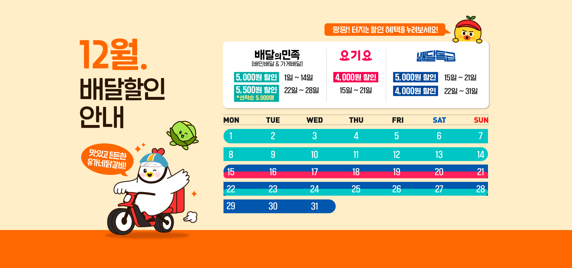 [유가네닭갈비 12월 배달 할인 프로모션 안내] 1. 배달의 민족 - 할인 내용 : 5,000원 할인 - 일정 : 12/1(월)~12/14(일) - 참여 방법 ① '배달의민족' 앱 내 브랜드관을 통해서 최대 5,000원 할인 쿠폰 다운로드 ② 가게배달 : 25,000원 이상 주문 시 배민배달 : 25,000원 이상 주문 시 ③ 결제 시, 다운로드한 쿠폰 적용 1-2. 배달의 민족 푸드페스타 - 할인 내용 : 5,500원 할인(선착순 5,000명) - 일정 : 12/22(월)~31(수) - 참여 방법 ① '배달의민족' 앱 내 푸드페스타 및 브랜드관을 통해서 최대 5,500원 할인 쿠폰 다운로드 ② 가게배달 :...