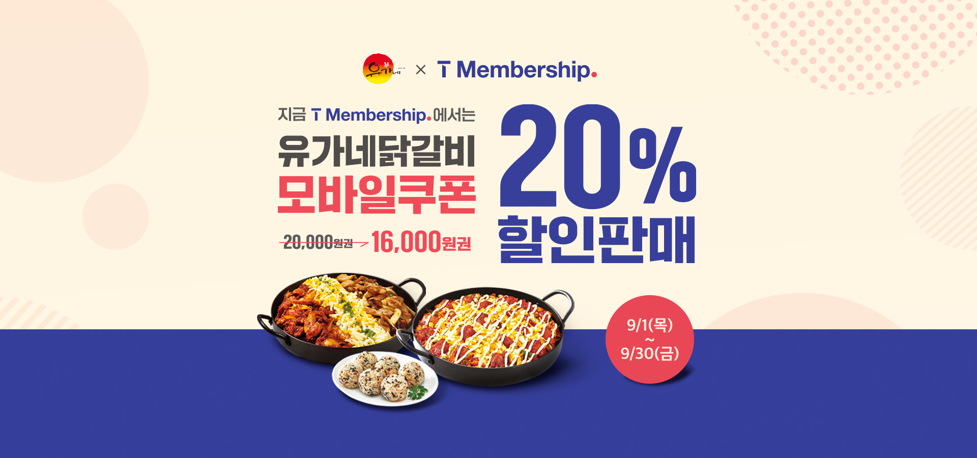 1. 기간 : 2022년 9월 1일(목) ~ 2022년 9월 30일(금) 2. 내용 : SKT T멤버십 고객 대상 유가네 모바일쿠폰 20,000원권 20% 할인 판매(16,000원 판매) 3. 참여 방법 1) T멤버십 앱 로그인 2) 이벤트 페이지 내 '9월 기프티콘 기획전' 클릭 3) 유가네닭갈비 모바일쿠폰 구매 4. 프로모션 미진행 매장 - 명동역점, 명동1호점, 명동2호점, 명동3호점, 광주유스퀘어점, 대전은행점, 남포점, 연산점, 세종시청점 5. 유의사항 [모바일쿠폰 이용안내] - 주문 및 결제 시, 해당 쿠폰을 제시해주시기 바랍니다. - 해당 프로모션은 모바일쿠폰 구매 할인 프로모션으로, 모바일쿠폰 구입 후 사용해주시기 바랍니다. - 배달 주문 시, 본 모바일쿠폰 사용 가능 여부는 매장 별로 상이...