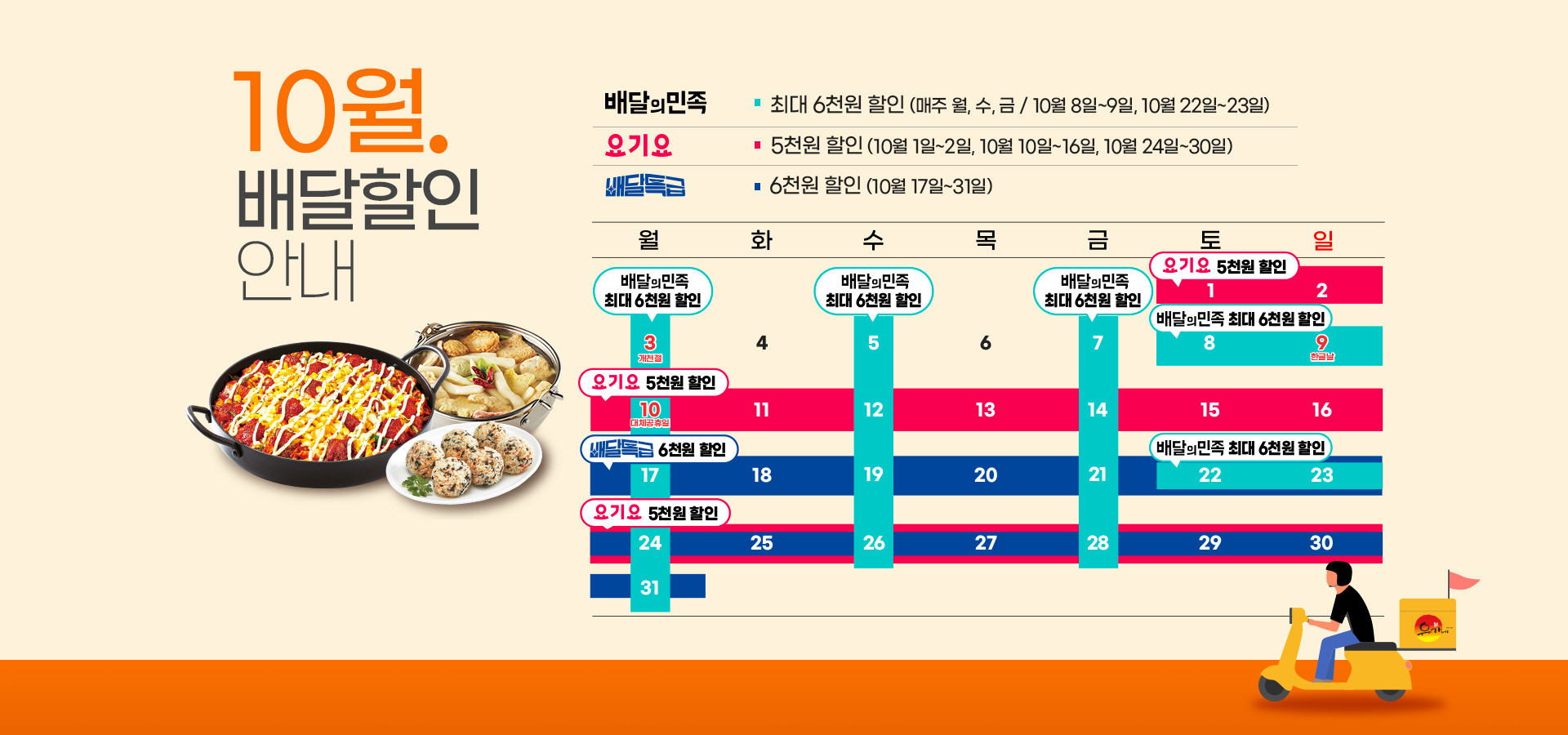 [유가네닭갈비 10월 배달 할인 프로모션 안내] 1. 요기요 - 할인 내용 : 1, 3, 5주차 5,000원 할인 - 일정 : 10/1~2일(토~일), 10/10~16일(월~일), 10/24~30일(월~일) ① '요기요' 앱을 통해 주문 시, 자동 할인 혜택 적용 ② '요기서 1초 결제' 또는 '요기서 결제' 이용 시에만 할인 적용 가능 2. 배달의 민족 - 할인 내용 : 매주 월, 수, 금 / 2, 4주차 주말 최대 6,000원 할인 - 일정 : 매주 월, 수, 금 / 주말(10/8~9일(토~일), 10/22~23일(토~일)) - 참여 방법 ① '배달의민족' 앱 내 브랜드관을 통해서 최대 6,000원 할인 쿠폰 다...