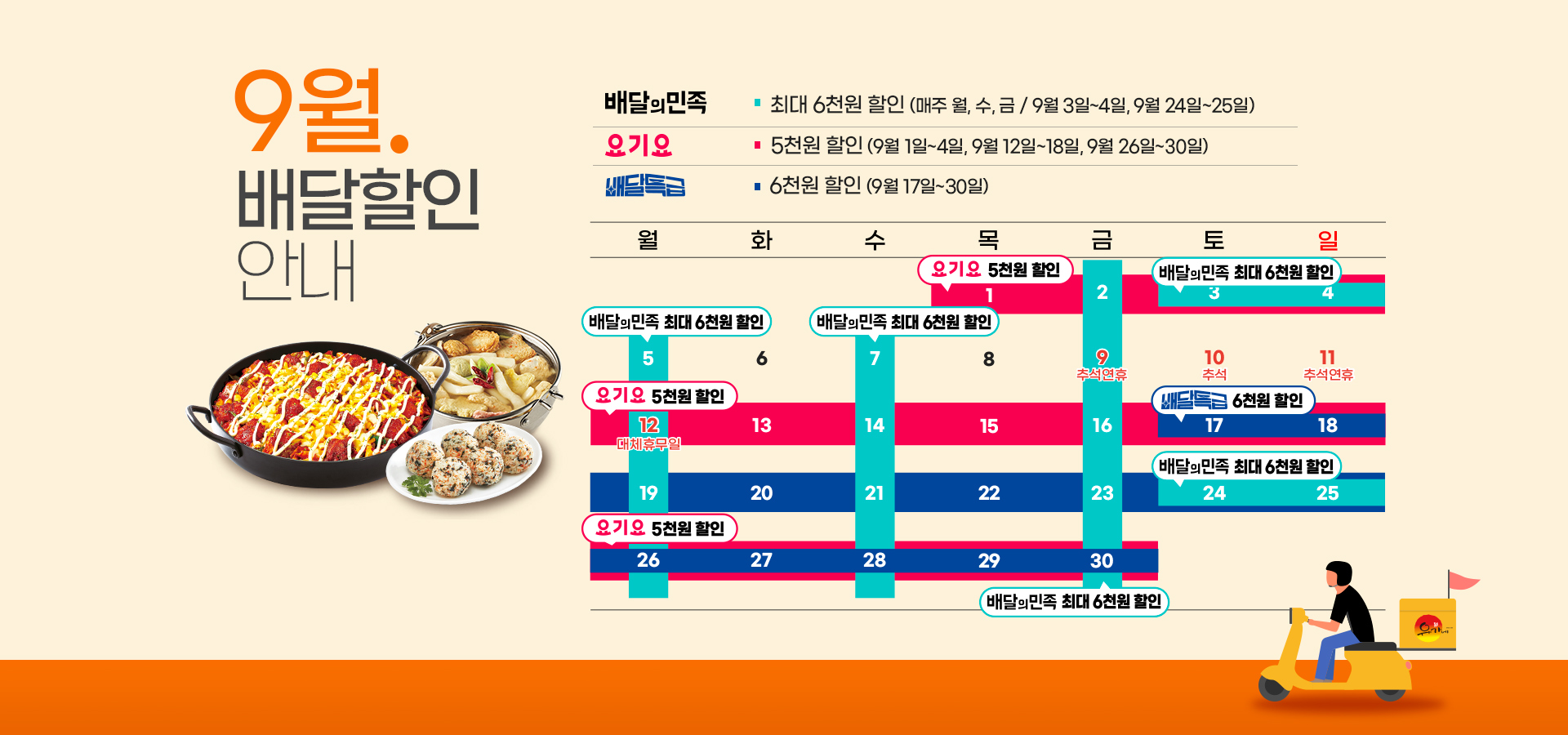 [유가네닭갈비 9월 배달 할인 프로모션 안내] 1. 요기요 - 할인 내용 : 1, 3, 5주차 5,000원 할인 - 일정 : 9/1~4일(목~일), 9/12~18일(월~일), 9/26~30일(월~금) ① '요기요' 앱을 통해 주문 시, 자동 할인 혜택 적용 ② '요기서 1초 결제' 또는 '요기서 결제' 이용 시에만 할인 적용 가능 2. 배달의 민족 - 할인 내용 : 매주 월, 수, 금 / 1, 4주차 주말 최대 6,000원 할인 - 일정 : 매주 월, 수, 금 / 주말(9/3~4일(토~일), 9/24~25일(토~일)) - 참여 방법 ...