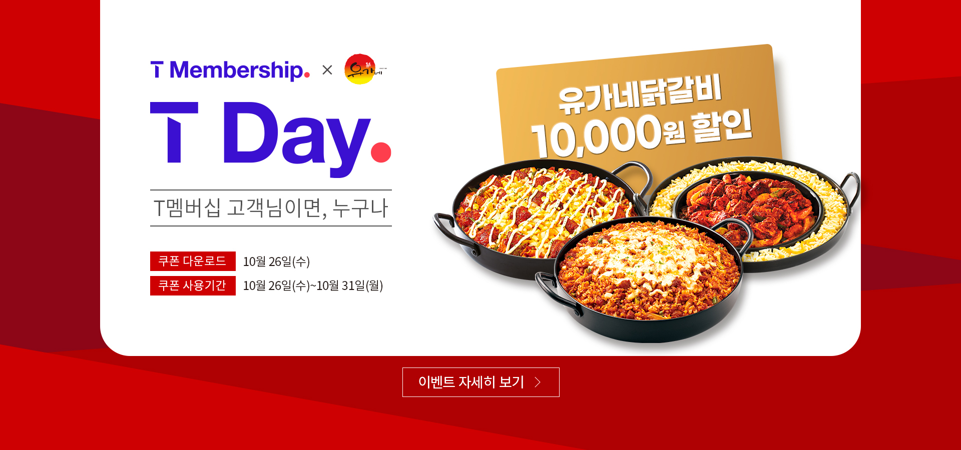 1. 쿠폰 다운로드 및 사용 기간 : 2022년 10월 26일(수) ~ 2022년 10월 31일(월) / 다운로드 10월 26일 하루 2. 이용 방법 1) T멤버십 앱 로그인 2) T Day 이벤트 페이지에서 쿠폰 다운로드 3) T멤버십 페이지 오른쪽 위 '≡' 선택 4) 'MY' [혜택 쿠폰함]에서 다운로드한 쿠폰 확인 5) 유가네 닭갈비 매장에서 결제 시 직원에게 쿠폰 제시 3. 쿠폰 혜택 : 2만 5천원 이상 결제 시, 1만원 할인 4. 프로모션 미진행 매장 - 명동역점, 명동 1호점, 명동 2호점, 명동 3호점, 광주유스퀘어점, 대전은행점, 남포점, 연산점, 세종시청점 5. 유의사항 - 행사 기간 동안 유가네 닭갈비에서 테이블당 1회, 1개 사용하실 수 있습니다. -...