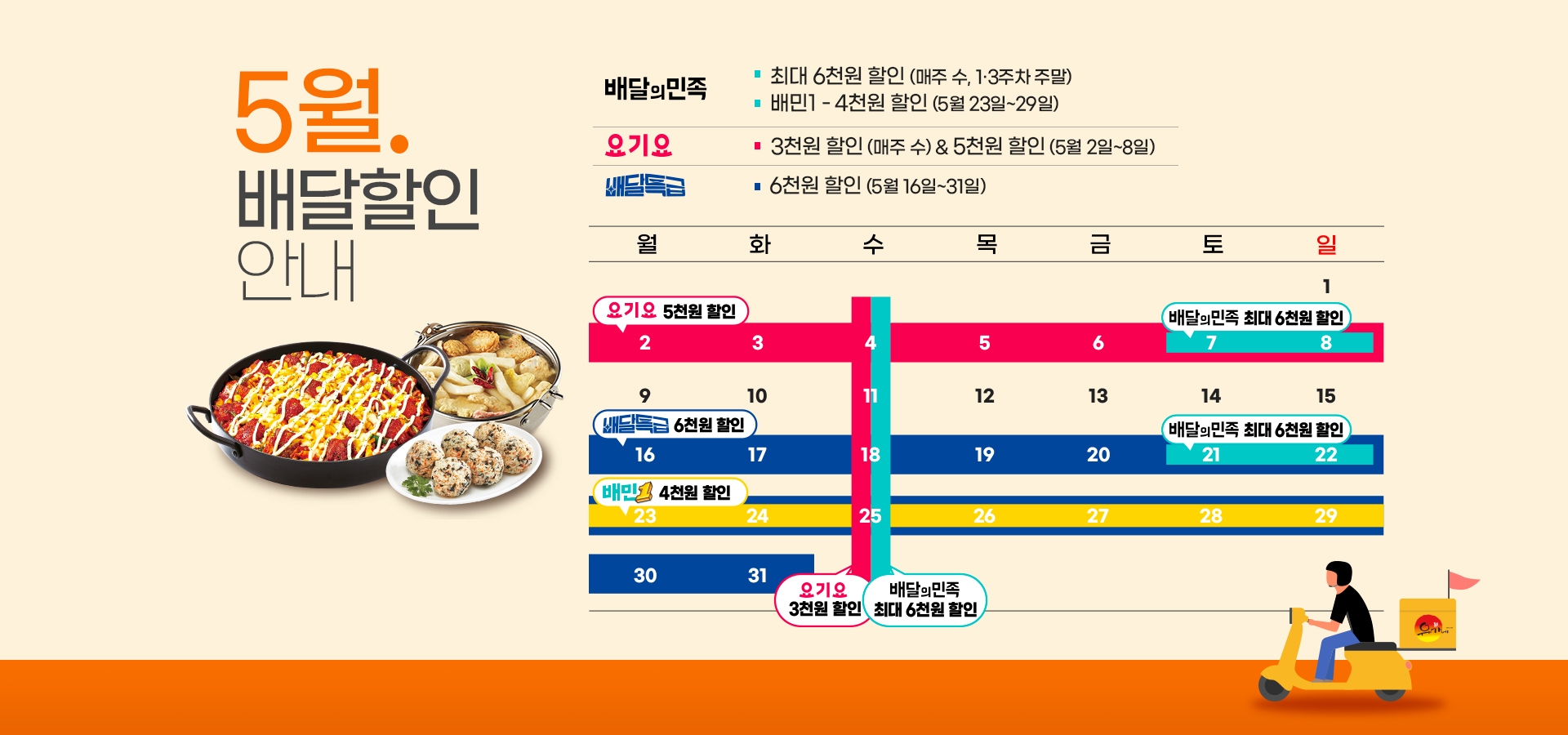 [유가네닭갈비 5월 배달 할인 프로모션 안내] 1. 배달의민족 - 할인 내용 : 매주 (수), (1주차, 3주차 주말) 최대 6,000원 할인 - 일정 : 5월 매주 (수), (1주차 주말), (3주차 주말) - 참여 방법 ① '배달의민족' 앱 내 브랜드관을 통해서 최대 6,000원 할인 쿠폰 다운로드 ② 결제 시, 다운로드한 쿠폰 적용 2. 배민1 - 할인 내용 : 7일간 배민1 4,000원 할인 - 일정 : 5월 23일~ 29일, 7일간 - 참여 방법 ① '배달의민족' 앱 배민원 4,000원 할인 쿠폰 다운로드 ② 결제 시, 다운로드한 쿠폰 적용 3. 요기요 - ...