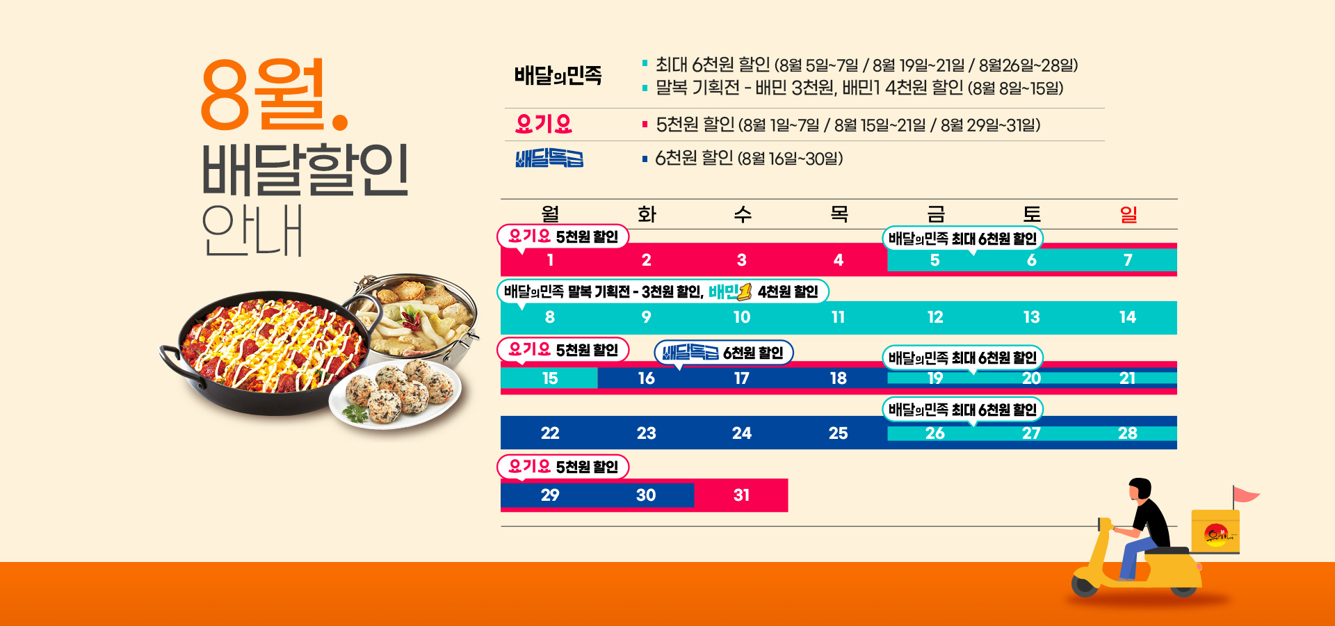 [유가네닭갈비 8월 배달 할인 프로모션 안내] 1. 요기요 - 할인 내용 : 7일간 5,000원 할인(마지막 주만 3일) - 일정 : 8월 1일~7일 + 8월 15일~21일 + 8/29일~31일 ① '요기요' 앱을 통해 주문 시, 자동 할인 혜택 적용 ② '요기서 1초 결제' 또는 '요기서 결제' 이용 시에만 할인 적용 가능 2. 배달의 민족 - 할인 내용 : 8월 5일~7일 + 8월 19일~21일 + 8월 26일~28일, 최대 6,000원 할인 - 일정 : 8월 5일~7일 + 8월 19일~21일 + 8월 26일~28일(총 3회) - 참여 방법 ① '배달의민족' 앱 내 브랜드관을 통해서 최대 6...