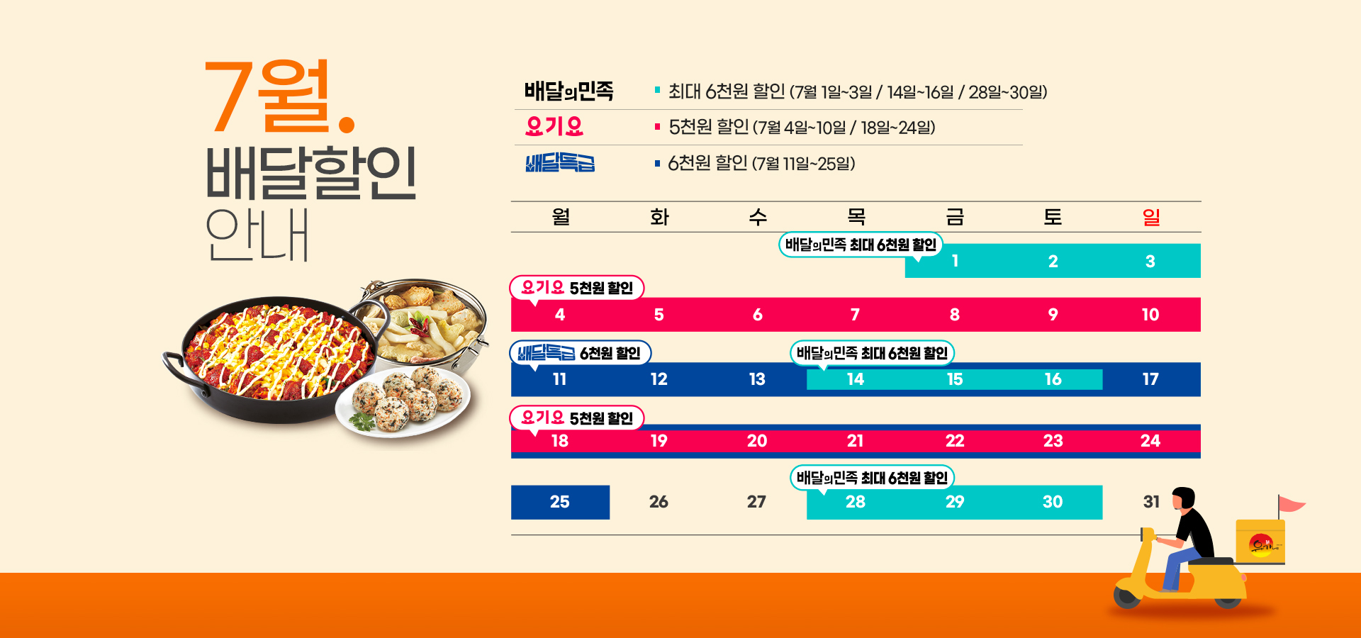 [유가네닭갈비 7월 배달 할인 프로모션 안내] 1. 배달의민족 - 할인 내용 : 7월 1일~3일 + 7월 14일~16일 + 7월 28일~30일, 최대 6,000원 할인 - 일정 : 7월 1일~3일 + 7월 14일~16일 + 7월 28일~30일(총 3회) - 참여 방법 ① '배달의민족' 앱 내 브랜드관을 통해서 최대 6,000원 할인 쿠폰 다운로드 ② 결제 시, 다운로드한 쿠폰 적용 2. 요기요 - 할인 내용 : 7일간 5,000원 할인 - 일정 : 7월 4일~10일 + 7월 18일~24일 (총 7일 / 2회) - 참여 방법 ① '요기요' 앱을 통해 주문 시, 자동 할인 혜택 적용 ② '요기서 1초 결제' 또는 '...