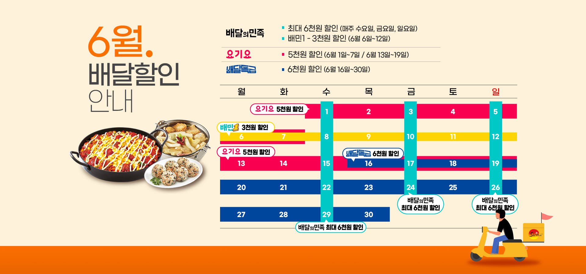 [유가네닭갈비 6월 배달 할인 프로모션 안내] 1. 배달의민족 - 할인 내용 : 매주 (수), (금), (일) 최대 6,000원 할인 - 일정 : 6월 매주 (수), (금), (일) - 참여 방법 ① '배달의민족' 앱 내 브랜드관을 통해서 최대 6,000원 할인 쿠폰 다운로드 ② 결제 시, 다운로드한 쿠폰 적용 2. 배민1 - 할인 내용 : 7일간 배민1 3,000원 할인 - 일정 : 6월 6일~ 12일, 7일간 - 참여 방법 ① '배달의민족' 앱 배민원 3,000원 할인 쿠폰...