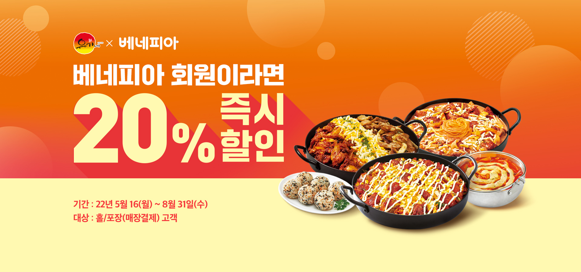 [베네피아 바로가게 20% 할인 프로모션] 기간 : 5월 16일(월)~ 8월 31일(수) * 약 3개월간 내용 : 베네피아 회원 중 바로가게 서비스 결제 고객 대상 20% 할인 프로모션 ※ 행사 미진행 매장 - 명동역점, 명동1호점, 명동2호점, 명동3호점, 광주유스퀘어점, 계명대점, 대전은행점, 수지점, 증산점, 울산구영점, 진량점, 인천동춘점 점포 제외 ※ 혜택 이용 안내 - 해당 프로모션은 베네피아 바로가게 서비스 통한 복지포인트 사용에 한해서 할인적용 됩니다. - 진행 가맹점 및 혜택은 가맹점 혹은 제휴사 사정으로 변경 또는 중단될 수 있습니다. - 타 프로모션과 중복 적용 불가합니다.(배달 및 타 이벤트 중복 적용 불가)