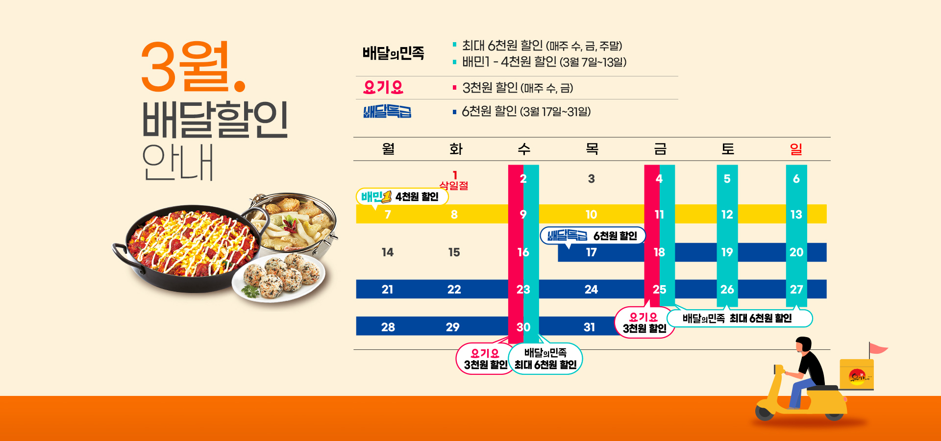 [유가네닭갈비 3월 배달 할인 프로모션 안내] 1. 배달의민족 - 할인 내용 : 매주 (수), (금), (주말) 최대 6,000원 할인 - 일정 : 3월 매주 (수), (금), (토), (일) - 참여 방법 ① '배달의민족' 앱 내 브랜드관을 통해서 최대 6,000원 할인 쿠폰 다운로드 ② 결제 시, 다운로드한 쿠폰 적용 2. 배민1 - 할인 내용 : 7일간 배민1 4,000원 할인 - 일정 : 3월 7일~ 13일, 7일간 - 참여 방법 ① '배달의민족' 앱 배민원 4,000원 할인 쿠폰 다운로드 ② 결제 시, 다운로드한 쿠폰 적용 3. 요기요 - 할인 내용...