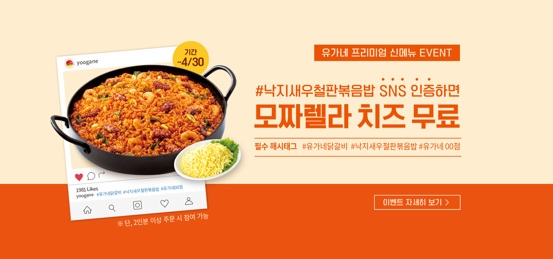 [낙지새우철판볶음밥 SNS 인증 프로모션] 1. 기간 : 1/27 ~ 4/30 2. 내용 : 낙지새우철판볶음밥 2인 이상 주문하고 SNS 인증하면 모짜렐라 치즈사리 무료 증정 3. 참여 방법 - 매장에서 낙지새우철판볶음밥 2인 이상 주문 시, 직원에게 프로모션 참여여부를 전달 - 메뉴 사진을 개인 SNS에 업로드 후 직원 확인을 받으면 모짜렐라 치즈사리 무료 제공(SNS 종류 무관) - 필수 해시태그 : #유가네닭갈비 #낙지새우철판볶음밥 #유가네 00점 [유의사항] * 방문 시, 테이블 당 1회 참여 가능합니다. (배달/포장 X) * SNS 업로드 후 반드시 매장 직원에게 확인이 필요합니다. * 세트, 할인 메뉴 주문 시, 적용되지 않습니다. * 타프로모션과 중복 적용이 불가...