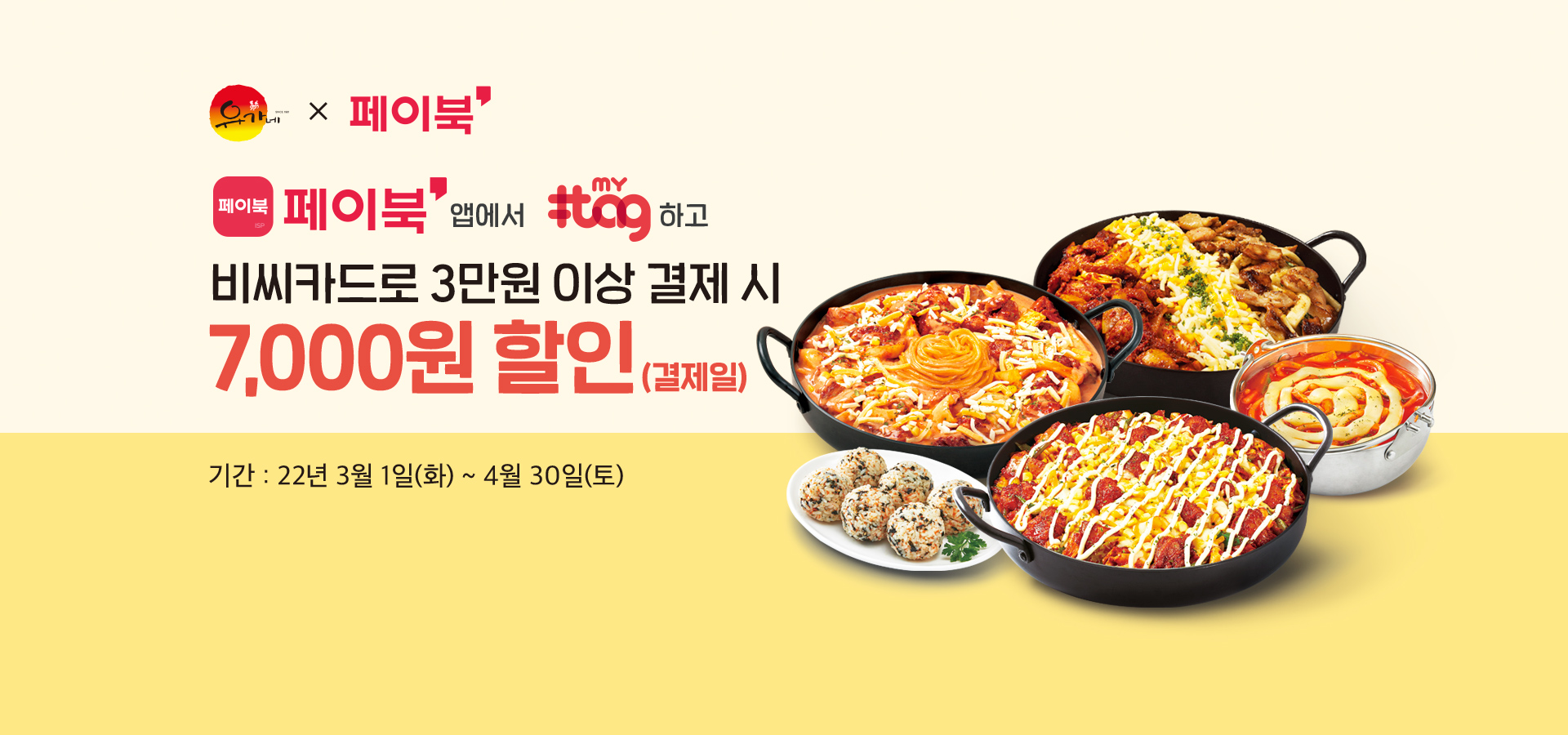 [비씨카드] 기간 : 3월 1일(화)~ 4월 30일(토) * 2개월간 대상 : BC페이북 이용자 중 유가네 마이태그 고객 대상 내용 : 3만원 이상 구매시 7천원 할인 ※ 행사 미진행 매장 - 수지점, 은평뉴타운점, 인천운서역점, 증산점, 남포점, 연산점, 계명대점, 세천점 점포 제외 ※ 혜택 이용 안내 - 기간 내 개별 결제 건에 혜택이 적용됩니다. - 행사 대상 가맹점 직접 방문 결제시 혜택이 적용됩니다.(배달, 포장 및 타 이벤트와 중복 적용불가) - 법인/선불/기프트카드 및 일부 간편결제 이용 시 혜택 적용 제외됩니다. - 본 이벤트는 당사 또는 제휴사의 사정에 따라 변경 또는 조기 종료될 수 있습니다. ※ 유의사항 •계약체결 전 카드 상품별 연회비, 이용조건 등에 관한 상세사...