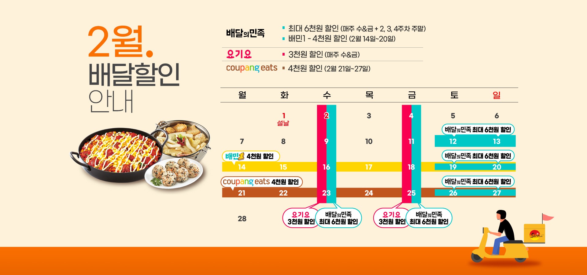 [유가네닭갈비 2월 배달 할인 프로모션 안내] 1. 배달의민족 - 할인 내용 : 매주 (수), (금) 최대 6,000원 할인, 주말 최대 6,000원 할인 - 일정 : 2월 매주 (수), (금) / (주말) 2월 12일~13일, 19~20일, 26~27일 - 참여 방법 ① '배달의민족' 앱 내 브랜드관을 통해서 최대 6,000원 할인 쿠폰 다운로드 ② 결제 시, 다운로드한 쿠폰 적용 2. 배민1 - 할인 내용 : 7일간 배민1 4,000원 할인 - 일정 : 2월 14일~ 20일, 7일간 - 참여 방법 ① '배달의민족' 앱 배민원 4,000원 할인 쿠폰 다운로드 ② 결제 시, 다운로드한 쿠폰 적용 3. 요기요 - 할인...