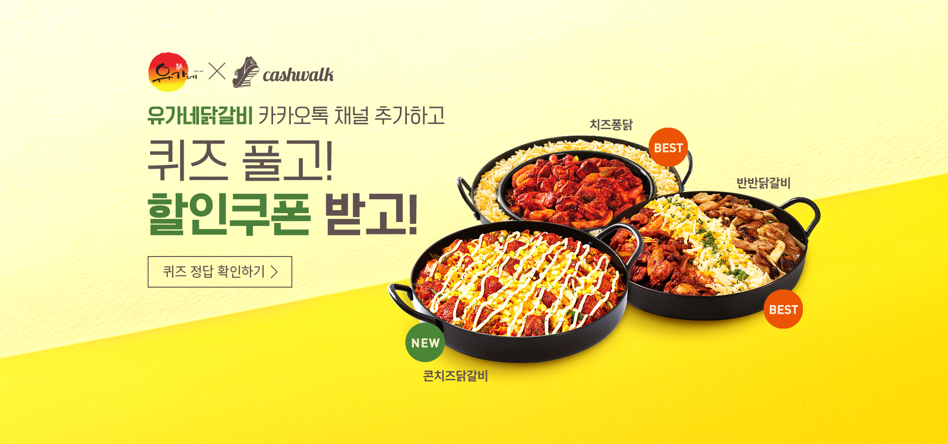 [유가네X캐시워크 '돈버는퀴즈'] 1. 기간 : 2011년 11월 11일(목) 오전 11시 2. 내용 및 참여 방법 - 캐시워크 앱에서 유가네닭갈비 '돈버는퀴즈' 참여하면 최대 1만 캐시 지급 - 유가네닭갈비 카카오톡 채널에서 퀴즈 정답 확인 - 채널 추가 및 쿠폰 다운로드 - 유가네닭갈비 카카오톡 채널 추가하기 : http://pf.kakao.com/_xdxeIms 3. 카카오톡 채널 추가 및 쿠폰 다운로드 방법 - 카카오톡에서 '유가네닭갈비' 검색 후 채널 추가 - 채널 내 '쿠폰 다운받기' 클릭 - 쿠폰 받기 후 나오는 바코드를 결제 시, 직원에게 제시하여 할인 적용 ...