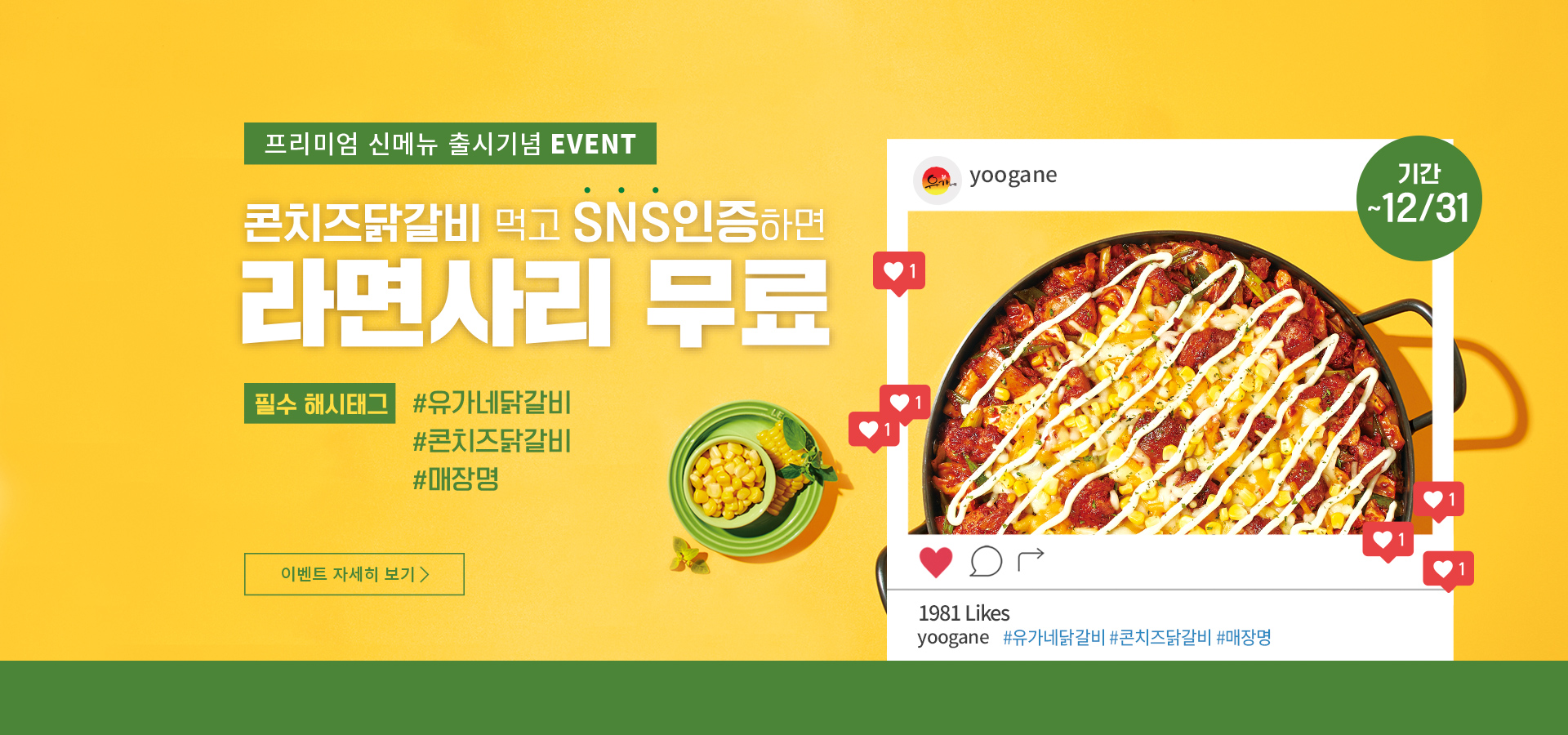 [콘치즈닭갈비 SNS 인증 프로모션] 1. 기간 : 10/7 ~ 12/31 2. 내용 : 콘치즈닭갈비 주문하고 SNS 인증하면 라면사리 무료 증정 3. 참여 방법 - 매장에서 콘치즈닭갈비 주문 시, 직원에게 프로모션 참여여부를 전달 - 콘치즈닭갈비를 개인 SNS에 업로드 후 직원 확인을 받으면 라면사리 무료 제공 - 필수 해시태그 : #유가네닭갈비 #콘치즈닭갈비 #매장명 [유의사항] * 방문 시, 테이블 당 1회 참여 가능합니다. (배달/포장 X) * SNS 업로드 후 반드시 매장 직원에게 확인이 필요합니다. * 세트, 할인 메뉴 주문 시, 적용되지 않습니다. * 타프로모...