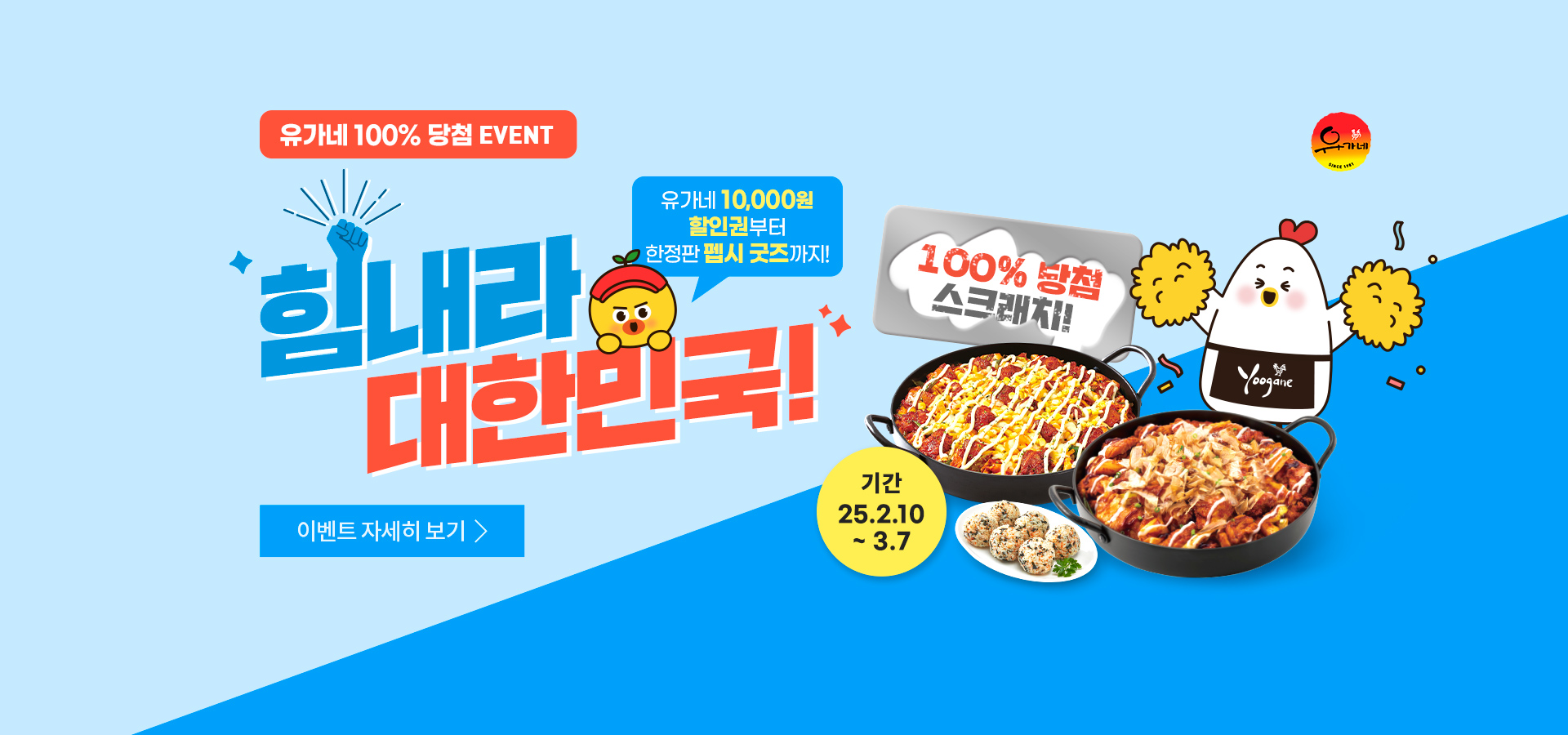 [힘내라! 대한민국! 응원 기념 이벤트] 1. 기간 : 2/10 ~ 3/7 2. 내용 : 유가네 카카오톡 친구하고, 펩시 굿즈부터 유가네 할인권 100% 경품 받자! 3. 참여 방법 - 유가네 카카오톡 친구추가 - 친구 대상 채팅방 게임 URL 클릭 - 본인인증 후 게임 참여 - 유가네 친구추가 하기(Click) 4. 경품 수령 - 펩시 테이블&의자는 3월 13~14일 발송 ※경품 당첨 시 개인정보 제공 동의 여부 '미동의' 시, 경품 발송이 제한될 수 있습니다. [유의사항] * 위 이미지 참고 ★해당 이벤트 쿠폰은 자동...