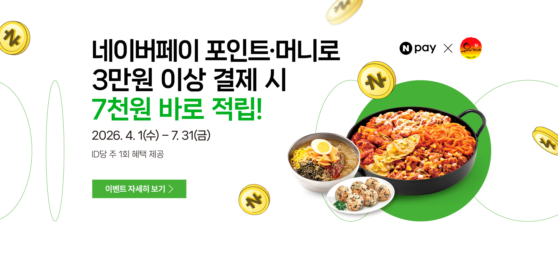 [이벤트 내용] 1. 기간 : 2026년 4월 1일 ~ 2026년 7월 31일 ※주 1회 참여 가능(4/1~5, 4/6~12, 4/7~19 등 매주 월~일 한 주 기준) 2. 내용 : 매장에서 3만 원 이상 네이버페이(머니&포인트) 결제 시, 7천 원 즉시적립(네이버포인트) 3. 참여방법 1) 매장에서 3만 원 이상 결제를 네이버페이 현장결제 네이버페이 포인트·머니로 전액 결제 2) 결제 후 바로 7천 원 네이버포인트 바로 적립받기! [유의사항] - 본 이벤트는 매장에서 네이버페이 현장결제 네이버페이 포인트·머니 3만원 이상 전액 결제 시, 포인트 7천원이 즉시 적립됩니다. - 이벤트 기간 ...