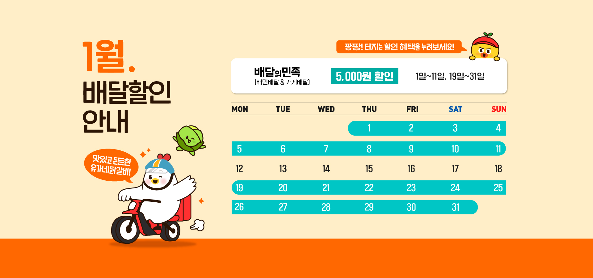 [유가네닭갈비 1월 배달 할인 프로모션 안내] 1. 배달의 민족 - 할인 내용 : 5,000원 할인 - 일정 : 1/1(목)~1/11(일), 1/19(월)~1/31(토) - 참여 방법 ① '배달의민족' 앱 내 브랜드관을 통해서 최대 5,000원 할인 쿠폰 다운로드 ② 가게배달 : 25,000원 이상 주문 시 배민배달 : 25,000원 이상 주문 시 ③ 결제 시, 다운로드한 쿠폰 적용