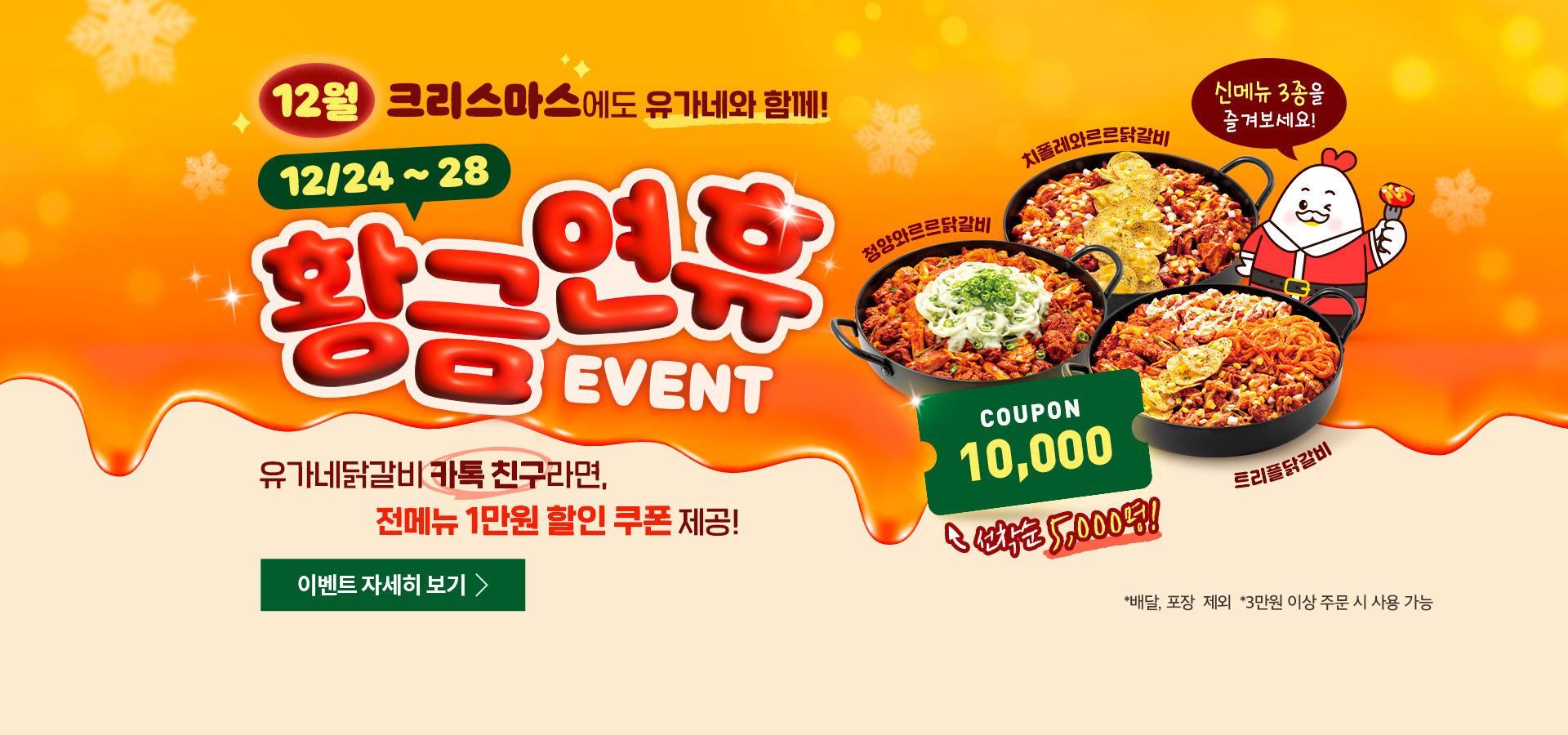 [유가네 12월 크리스마스 황금연휴 프로모션] 1. 기간 : 2025.12.24(수) ~ 12.28(일) *쿠폰 사용 기한 ~12.28(일) 2. 내용 : 2025년 마지막 연휴, 행복한 크리스마스에는 가족과 함께 유가네 신메뉴를 즐겨보세요! 유가네 카카오톡 채널 추가는 필수 3. 참여 방법 - 유가네 공식 카카오톡 채널 추가하기 - 유가네 10,000원 쿠폰 다운로드 받기(선착순 5천 명) - 우리집 근처 유가네닭갈비에 방문해 신메뉴 먹으며 크리스마스 연휴 보내기! *사용 불가 매장 및 신메뉴 판매 매장을 꼭! 확인하고 방문해 주세요 [유의사항] · 본 쿠폰은 2025년 12월 24일 ~ 12월 28일 연휴 기간동안 사용 가...