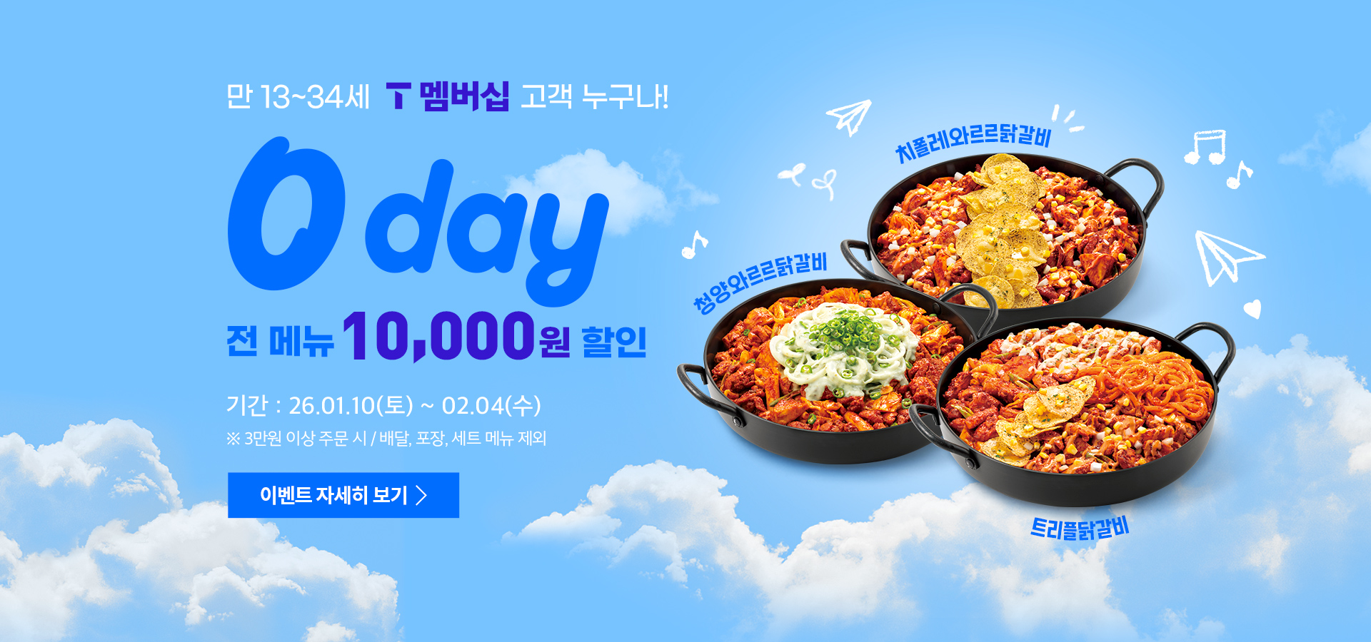 1. 기간 : 2026년 01월 10일(토) ~ 2026년 02월 04일(수) 2. 내용 : 유가네 매장에서 3만원 이상 결제 시, 1만원 할인 3. 참여방법 1) T멤버십 앱 - 쿠폰 다운로드 방법 : 로그인 → 0 day 이벤트 페이지 → 유가네닭갈비 쿠폰 다운로드 - 쿠폰 사용 방법 : 로그인 → 오른쪽 위 '≡' 선택 → ‘MY’ 쿠폰함에서 다운로드한 쿠폰 확인 → 유가네닭갈비 매장 직원에게 쿠폰 제시 2) 에이닷 앱 - 쿠폰 다운로드 방법 : 로그인 → 왼쪽 위 '≡' 선택 → T서비스 → 0 day 이벤트 페이지 → 유가네닭갈비 쿠폰 다운로드 - 쿠폰 사용 방법 : 로그인 → 왼쪽 위 '≡' 선택 → ...