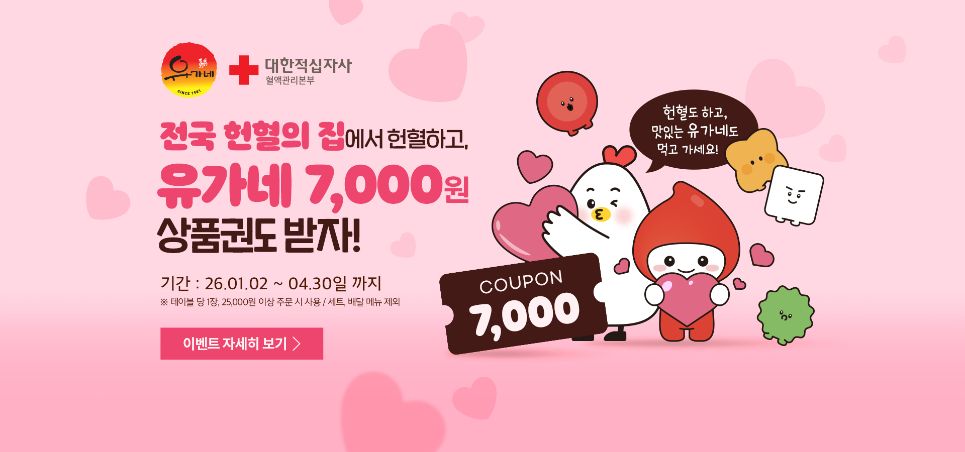 [유가네 X 대한적십자사 헌혈 프로모션] 1. 기간 : 2026.01.02 ~ 04.30 / 상품권 소진시까지 *상품권 사용은 2026.04.30까지 가능 2. 내용 : 전국 헌혈의집에서 헌혈하고, 유가네 7,000원 금액권 받자! 3. 참여 방법 - 전국 헌혈의 집에 방문해 생명을 나누는 헌혈하기(전혈, 혈장, 혈소판 등 모두 가능) - 유가네 7,000원 금액권 받기 - 근처 유가네닭갈비에 방문해 든든한 한끼로 체력 보충! *사용 불가 매장을 꼭! 확인하고 방문해 주세요 [유의사항] · 본 상품권은 2026년 4월 30일까지 사용 가능합니다. (기간 만료 시 사용 및...