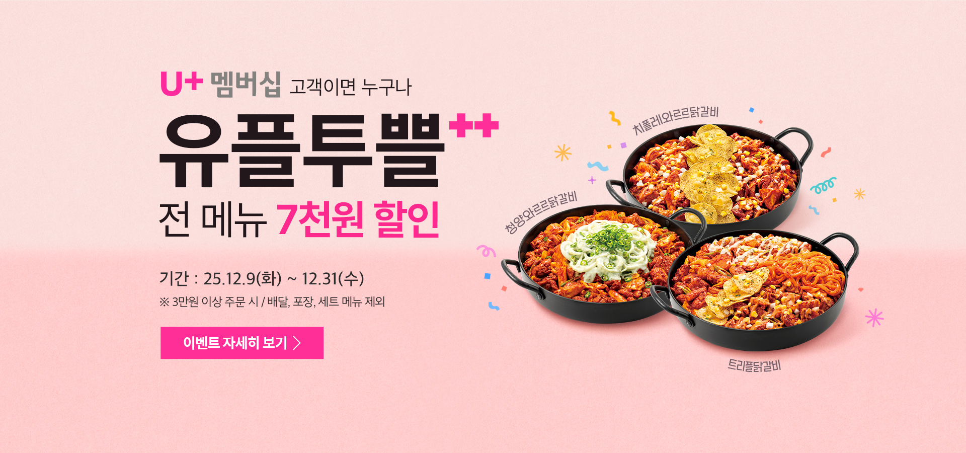 1. 기간 : 2025년 12월 9일(화) ~ 2025년 12월 31일(수) 2. 내용 : 유가네 매장에서 3만원 이상 결제 시, 7천원 할인 3. 참여방법 1) U+one 앱에서 유플투쁠 페이지 클릭 2) 유가네닭갈비 할인쿠폰 다운로드 3) 마이페이지 쿠폰함에서 유가네닭갈비 할인 쿠폰 클릭 4) 매장에서 직원에게 쿠폰(바코드)을 보여주면 사용 완료 4. 쿠폰 사용 관련 유의사항 - 발급받은 쿠폰은 취소 후 다른 쿠폰으로 재발급 불가합니다. - 선착순 쿠폰 소진, 전산 에러 등으로 인해 쿠폰 발급 불가 시 대체 혜택을 받으실 수 없습니다. - 유플러스 또는 유...