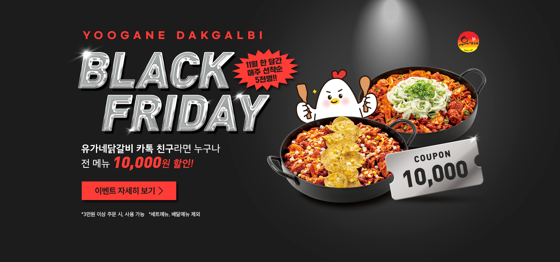 1. 기간 : 2025년 11월 7일(금) ~ 2025년 12월 7일(일) 2. 내용 : 매장에서 3만원 이상 결제 시, 1만원 할인 3. 참여방법 1) 유가네닭갈비 카카오톡 채널 친구 추가 2) 매주 금요일 발송되는 메세지 링크를 통해 쿠폰 선착순 다운받기! 3) 매장에서 직원에게 쿠폰을 보여주면 적용 완료 4. 쿠폰 사용 관련 유의사항 - 매주 발급되는 쿠폰 기간 만료 시 사용 및 유효기간 연장은 불가합니다. - 테이블 당 1회, 3만원 이상 주문 시 사용 가능합니다. - 매장 식사 시 사용 가능합니다.(포장&배달 불가, 세트메뉴, 음료&주류 미포함) - 사용 시 타...