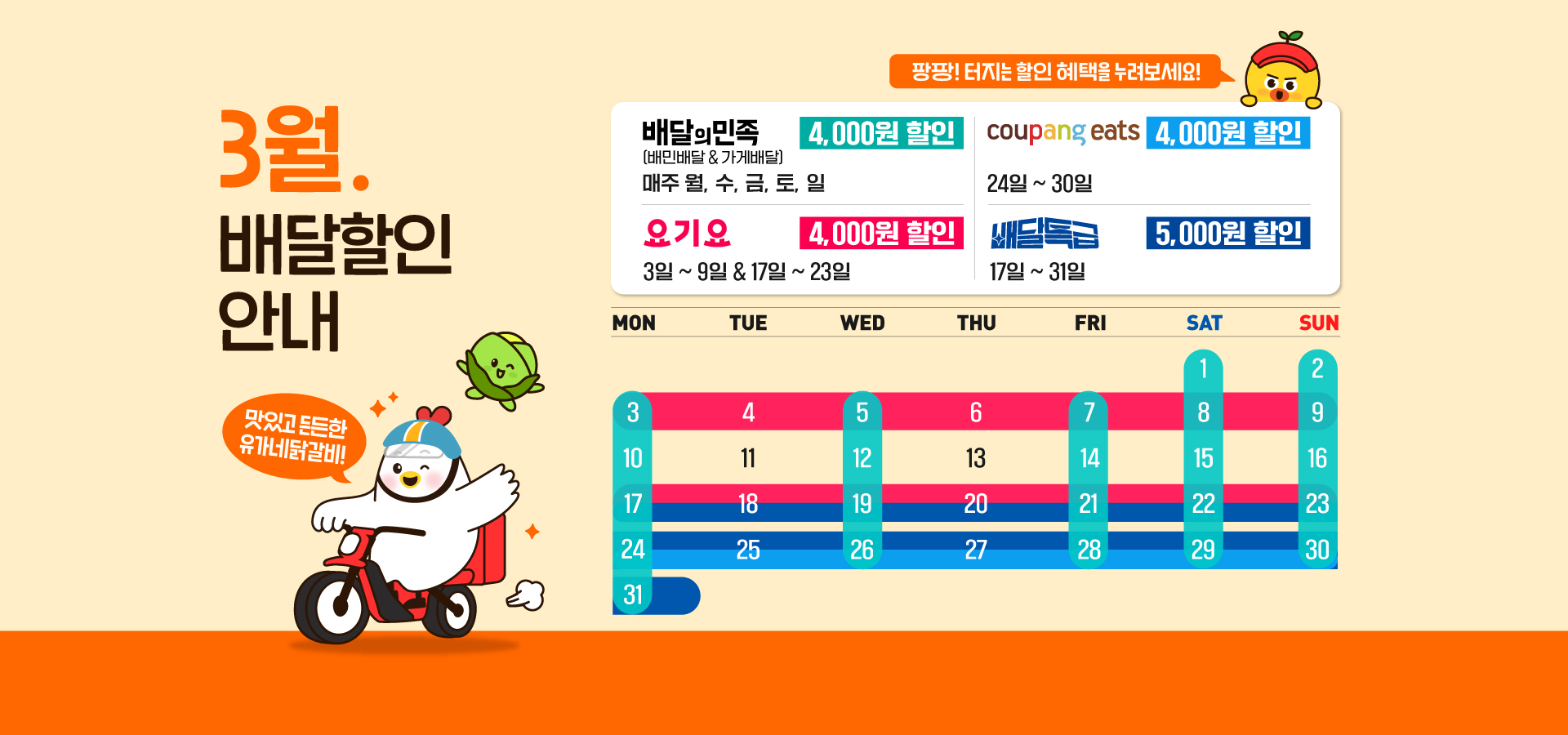 [유가네닭갈비 3월 배달 할인 프로모션 안내] 1. 배달의 민족 - 할인 내용 : 4,000원 할인 - 일정 : 매주 월, 수, 금, 토, 일 - 참여 방법 ① '배달의민족' 앱 내 브랜드관을 통해서 최대 4,000원 할인 쿠폰 다운로드 ② 결제 시, 다운로드한 쿠폰 적용 2. 쿠팡이츠 - 할인 내용 : 4주차 4,000원 할인 - 일정 : 3/24~30일(월~일) ① '쿠팡이츠' 앱 내 쿠폰 다운로드 3. 요기요 - 할인 내용 : 1, 3주차 4,000원 할인 - 일정 : 3/3~9일(월~일), 3/17~23(월~일) ① '요기요' 앱을 통해 주문 시, 자동 할인 혜택 적용