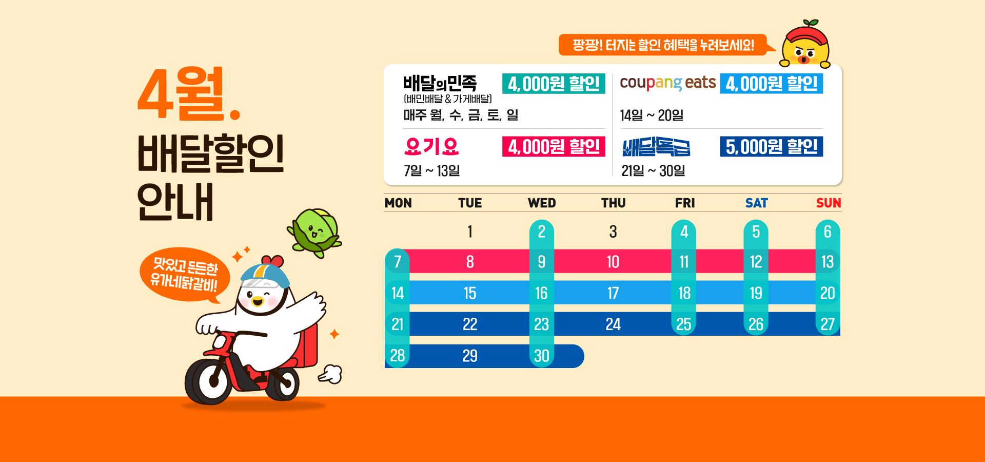 [유가네닭갈비 4월 배달 할인 프로모션 안내] 1. 배달의 민족 - 할인 내용 : 4,000원 할인 - 일정 : 매주 월, 수, 금, 토, 일 - 참여 방법 ① '배달의민족' 앱 내 브랜드관을 통해서 최대 4,000원 할인 쿠폰 다운로드 ② 결제 시, 다운로드한 쿠폰 적용 2. 쿠팡이츠 - 할인 내용 : 3주차 4,000원 할인 - 일정 : 4/14~20일(월~일) ① '쿠팡이츠' 앱 내 쿠폰 다운로드 3. 요기요 - 할인 내용 : 2주차 4,000원 할인  ...