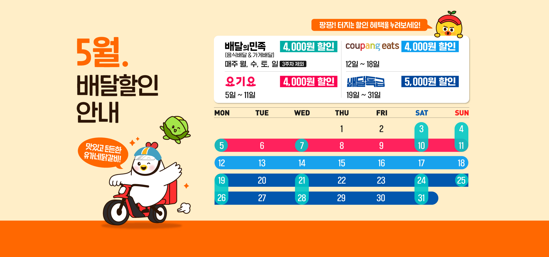 [유가네닭갈비 5월 배달 할인 프로모션 안내] 1. 배달의 민족 - 할인 내용 : 4,000원 할인 - 일정 : 매주 월, 수, 토, 일 / 3주차 제외 - 참여 방법 ① '배달의민족' 앱 내 브랜드관을 통해서 최대 4,000원 할인 쿠폰 다운로드 ② 가게배달 : 25,000원 이상 주문 시 배민배달 : 28,000원 이상 주문 시 ③ 결제 시, 다운로드한 쿠폰 적용 2. 쿠팡이츠 - 할인 내용 : 3주차 4,000원 할인 - 일정 : 5/1(월)~5/18일(일) ① '쿠팡이츠' 앱 내 쿠폰 다운로드 - 참여방법 ② '요기서 1초 결제' 또는 '요기서 결제' 이용 시에만 할인 적용 가능...