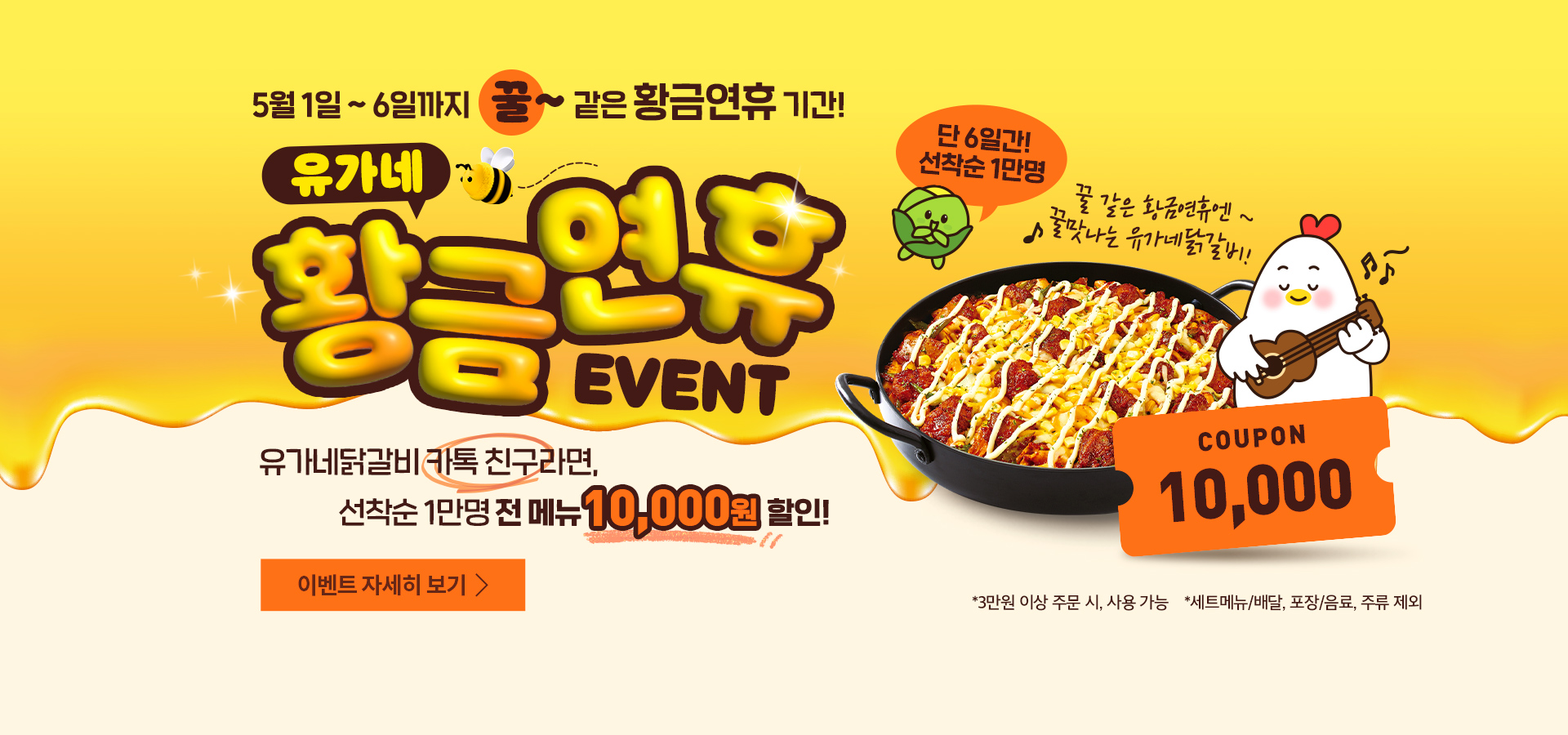 [유가네 황금연휴 프로모션] 1. 기간 : 2025.05.01(목) ~ 05.06(화) *상품권 사용은 2025.05.06까지 가능 2. 내용 : 고객 여러분이 더욱 알찬 황금연휴 보내시길 바라며 준비했습니다! 3. 참여 방법 - 유가네 공식 카카오톡 채널 추가하기 - 유가네 10,000원 쿠폰 다운로드 받기(선착순 1만 명) - 근처 유가네닭갈비에 방문해 든든한 한끼로 체력 보충! *사용 불가 매장을 꼭! 확인하고 방문해 주세요 [유의사항] · 본 쿠폰은 2025년 5월 1일 ~ 5월 6일 연휴 기간동안 사용 가능합니다.(기간 만료 시 사용 및 유효기간 연장...